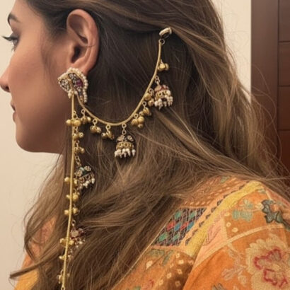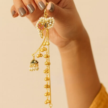 These handcrafted Jhumkas with Ear Chain exude heritage charm and timeless beauty. Adorned with intricate detailing and delicate beads, they add an effortless regal touch — perfect for weddings, festive events, or traditional celebrations